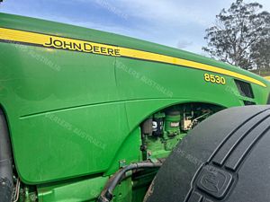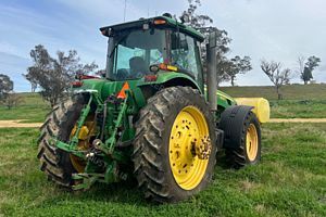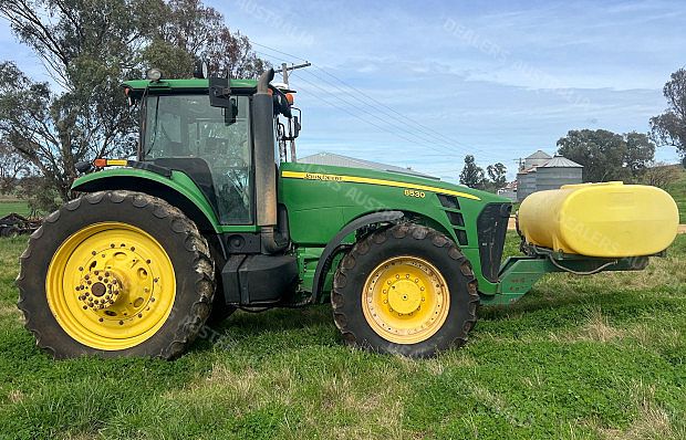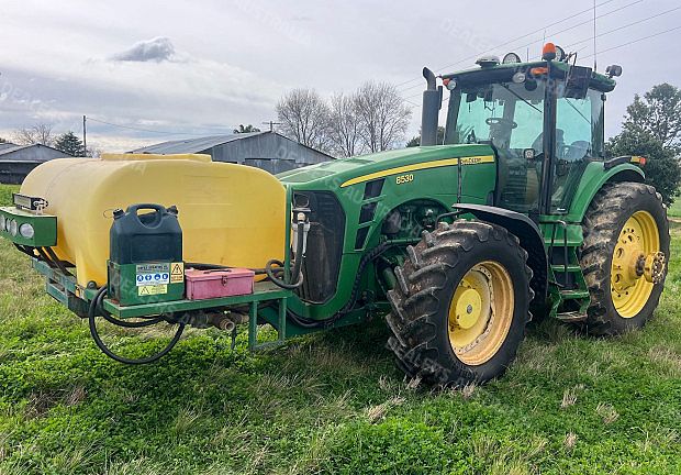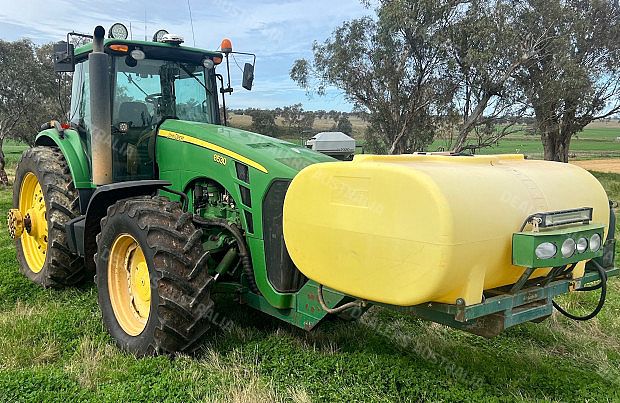 John Deere 8530 Tractor, 330 horsepower, 12451 hours, IVT transmission, 4 remotes, 3 point linkage w/quickhitch, 1000rpm PTO, Hayes 1500 litre front tank w/ hypro pump and lights, front 480/70R34 tyres 90% rubber, rear dual 480/80R50 tyres inner 40% outer 20% rubber, inner rear wheel weights, Trimble GFX 750 w/EZ Pilot Pro Steering, good condition, located near Merriwa NSW, price includes GST