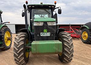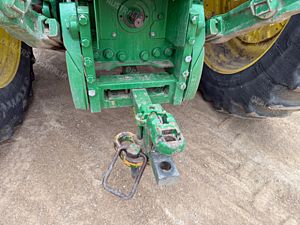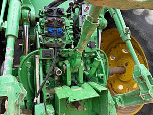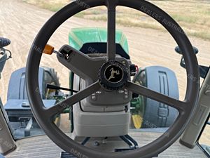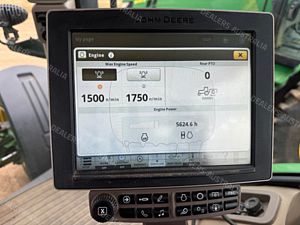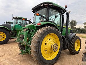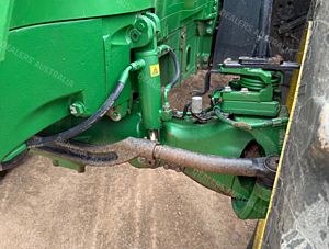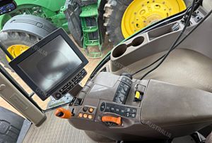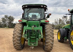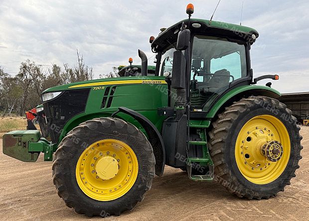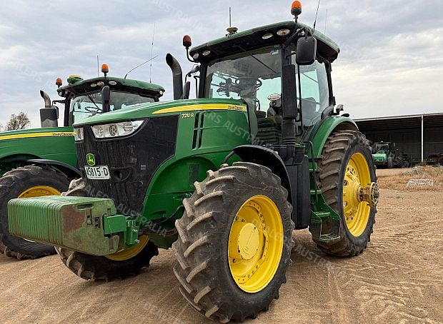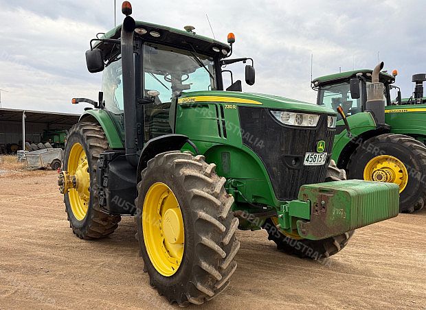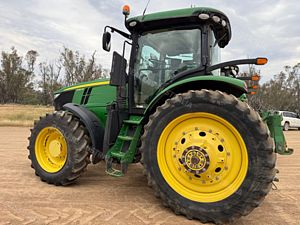 John Deere 7210R Tractor, 2015 model, 210 horsepower, 5624 hours, CommandQuad transmission (50km/h), front axle suspension, front 420/85R34 tyres 60% rubber, rear dual 480/80R50 tyres 40% rubber, 3 point linkage w/quickhitch, 4 remote, 1000rpm PTO, front weight pack, GPS receiver not included, one owner, full dealer service history, good condition, near Condobolin NSW, includes GST