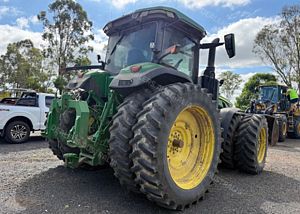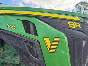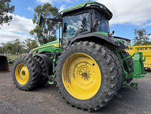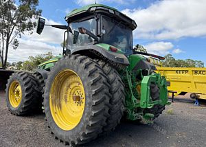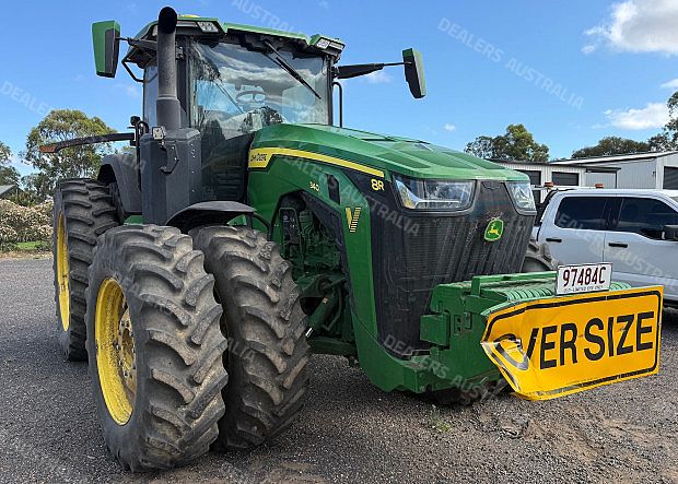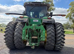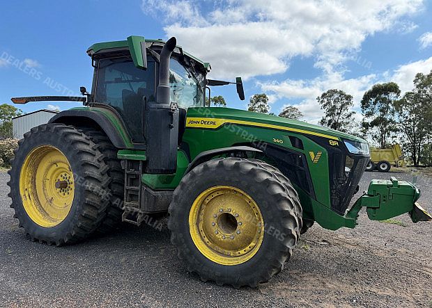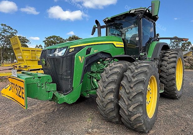 John Deere 8R340 Tractor, 2020 model, 340 horsepower, 3477 hours, IVT transmission, ILS suspended axle, front dual 480/70R34 tyres 30% rubber, rear dual 480/80R50 tyres 20% rubber, SF6000 receiver (SF1), front suitcase weights, rear wheel weights, one owner, not included - tyres pressure sensor not included, good condition, near Millmerran QLD, includes GST