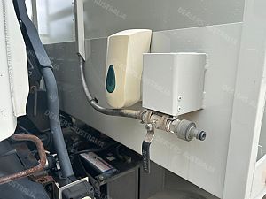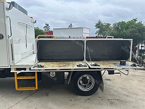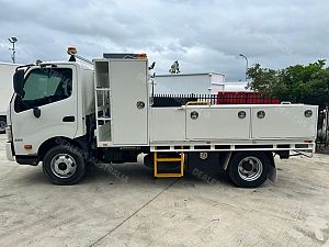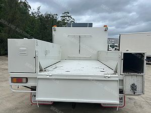 Fitted with steel service body with 5 storage tool boxes, reverse camera, 3500kg rated tow bar and canvas seat covers.