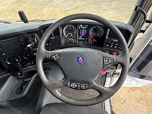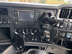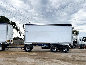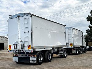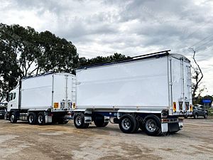 Combination Scania G480 tipper and Stoodley super dog, both fitted with high side alloy bodies, electric tarps, and grain chutes. Ready for bulk haulage or agricultural work.