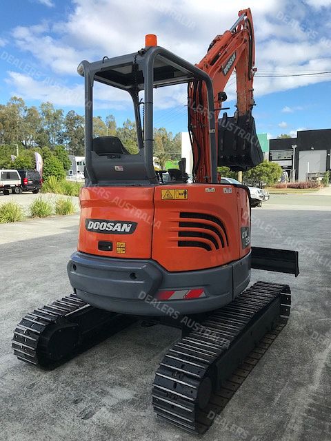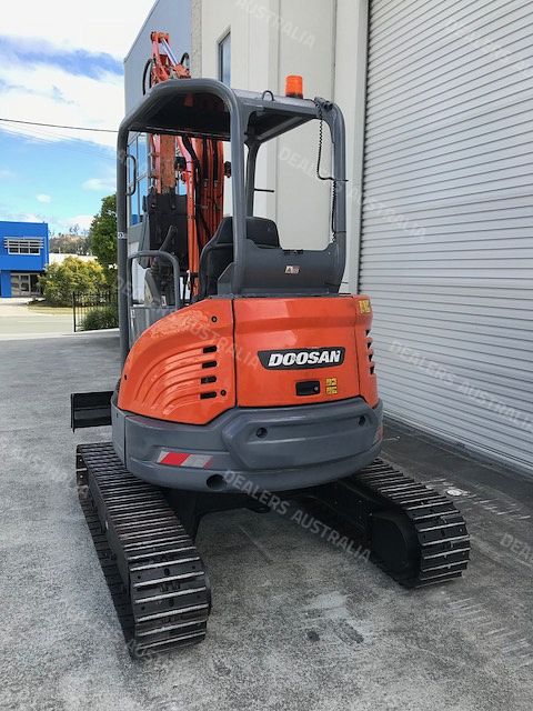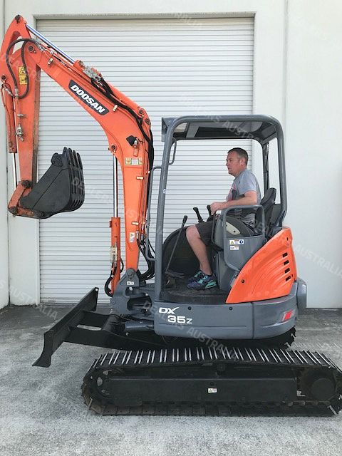 2015 Doosan DX35Z A 3.5 Ton mini excavator, with 0 swing body,rops canopy cab, mono swing boom piped for attachments, 300mm steel tracks, with dozer blade, powered by a Yanmar diesel engine, with mirrors and lights, flashing warning beacon, joystick controls,showing 1270 hours on digital hour meter, great machine and good value, this would suit builder/plumber/house reno or paddock work.